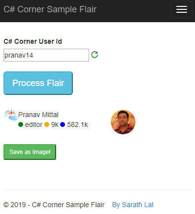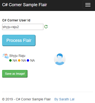 C# Corner itself provides the user flair. This is my humble attempt to scrape the data from C# Corner user profile page using HtmlAgilityPack in ASP.NET MVC application. We collected the user data like Name, Rank, Reputation, Reads from the corresponding span ids. We also got all the image URLs from the site (profile page) and only took the image used for the author's image. We will create a sample user flair using this data. Will also provide an option to save this flair as an image.