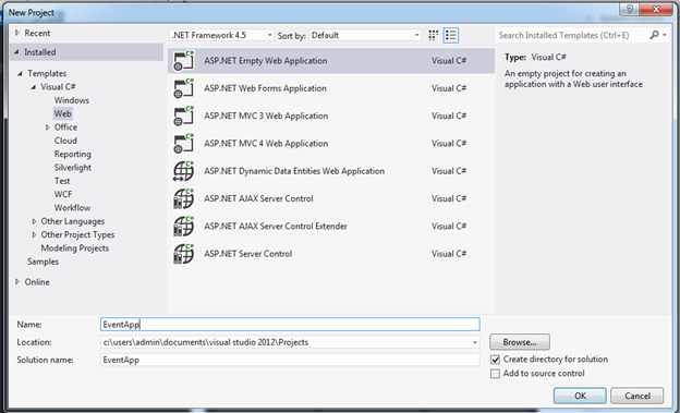 Open your latest version of Visual Studio. Select File, New, then Project to see the following screen.Under the section of Visual C#, click on ASP.NET Empty Web Application. Name it EventApp.