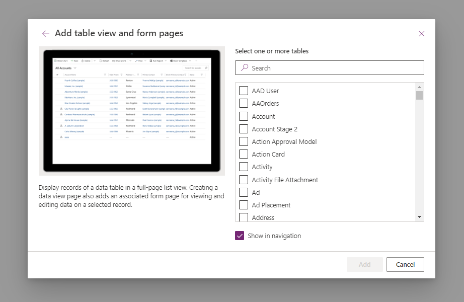 Display records of a data table in a full-page list view. Creating a data view page also adds an associated form page for viewing and editing data on a selected record.