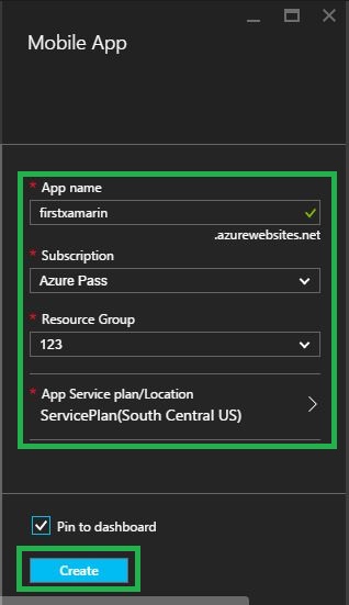 In the Mobile App account blade, specify the desired configuration for the Mobile App account (Name, & Resource Group). Click Create button at the bottom of the screen to create the Mobile App.