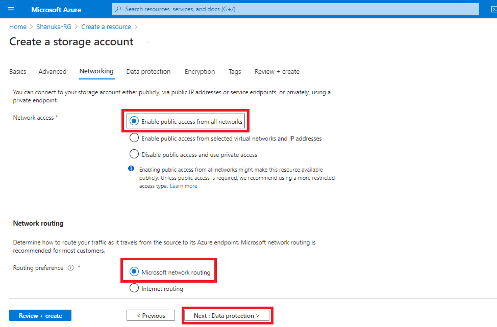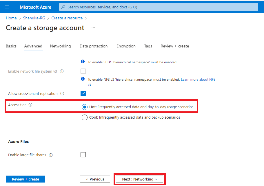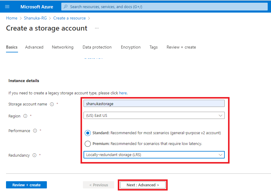 Important: Redundancy options are available (LRS, GRS, ZRS, and GZRS) as per your requirement you can choose the option. In my scenario, I have chosen LRS and clicked Next: Advanced