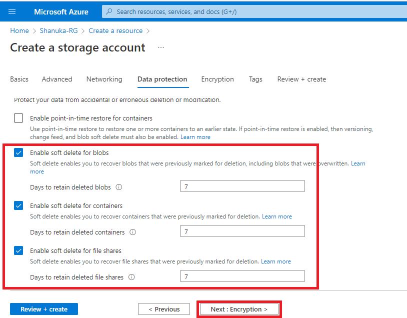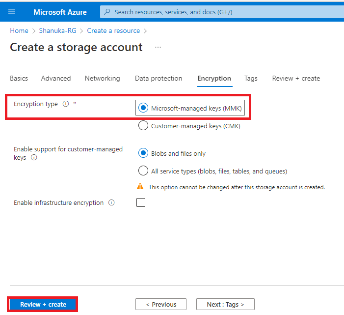 Encryption should be select Microsoft-Managed-Key (MMK) and Review+create