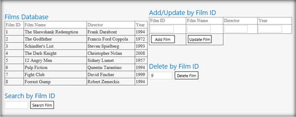 Here, ‘Search Film’ button will call the GET method issuing the Web API AJAX request. ‘Add Film’ button will call the POST method, ‘Update Film’ will call the Put method, and ‘Delete Film’ will call the DELETE method using the Web API URL. We will discuss in detail about these method calls in the upcoming section.