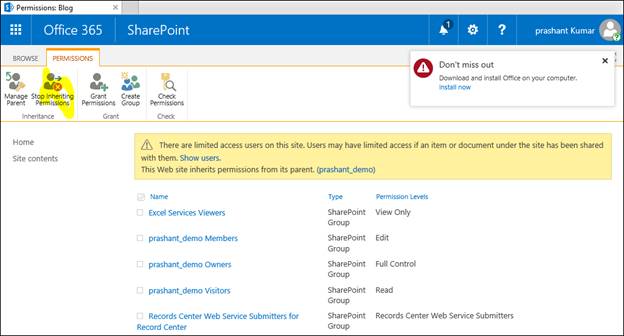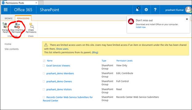 - Click Stop inheriting the permissions option from the Permission ribbon.