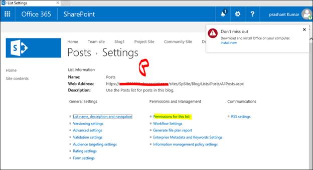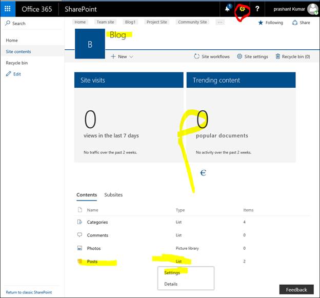 - Open SharePoint Blog page, select setting menu and select site contents options.