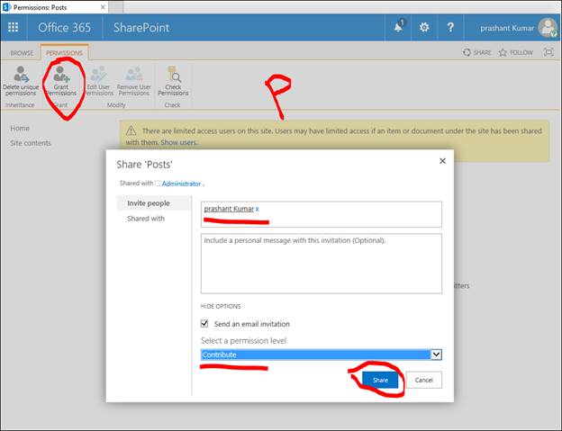 - Now, enter a user or Group name or an E-email address and click Show option and then select permission level from the dropdown templates, followed by clicking on share.