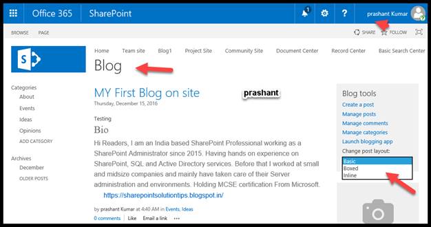 - Select Post Layout from Blogs tools on the Home page of SharePoint's Blog page.