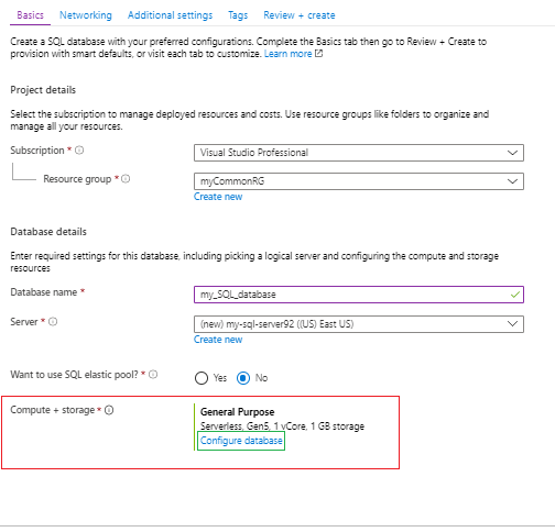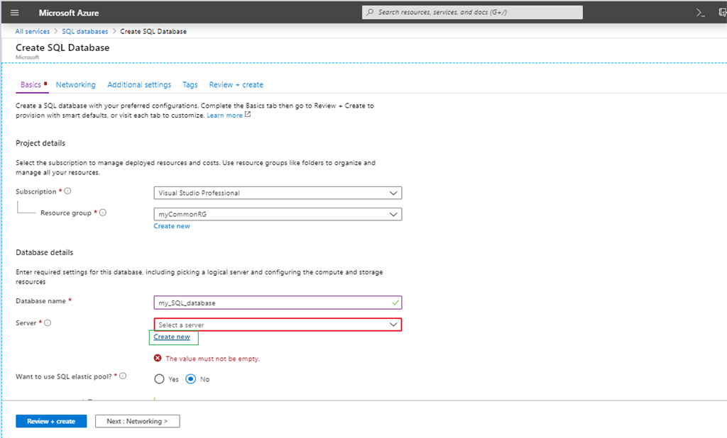 Here, we need to fill the database names and server. If we don't have a SQL server, we need to create a new server by clicking the Create new link highlighted in the above figure.
