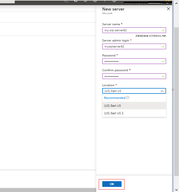 We need to fill the server name, admin name, password, location to create the SQL server. Then click the OK button to create the server.