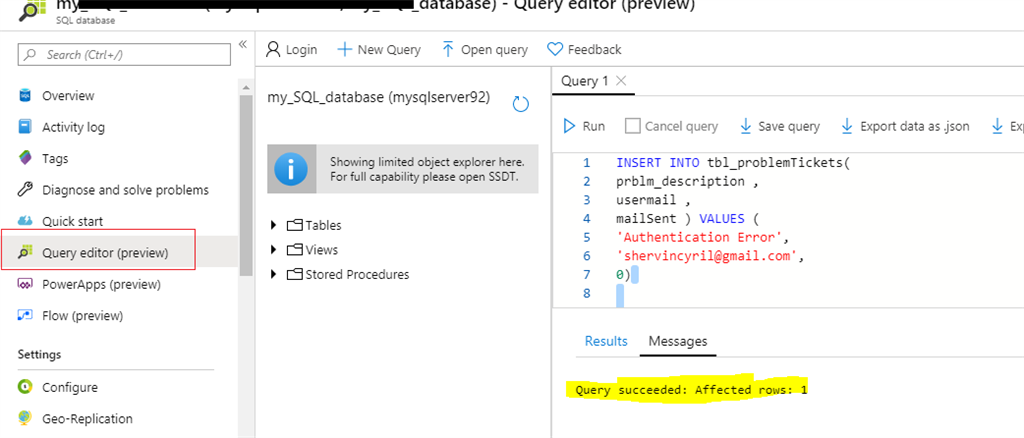 Let's try to INSERT a record using the query editor in the Azure portal.