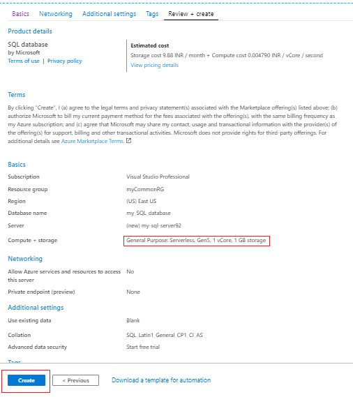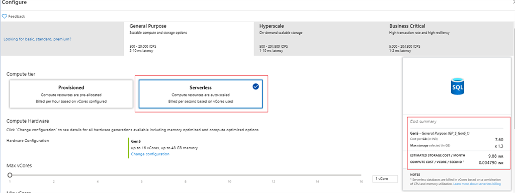Since this is a learning activity, I am going to select the Serverless option. Please refer to the screenshot below.