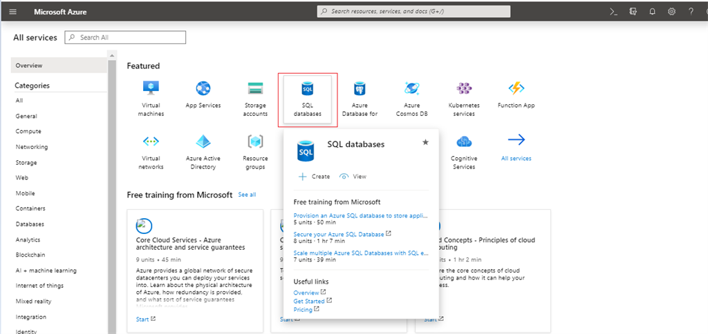 Then click the SQL database icon in the portal. Please refer to the screenshot below.