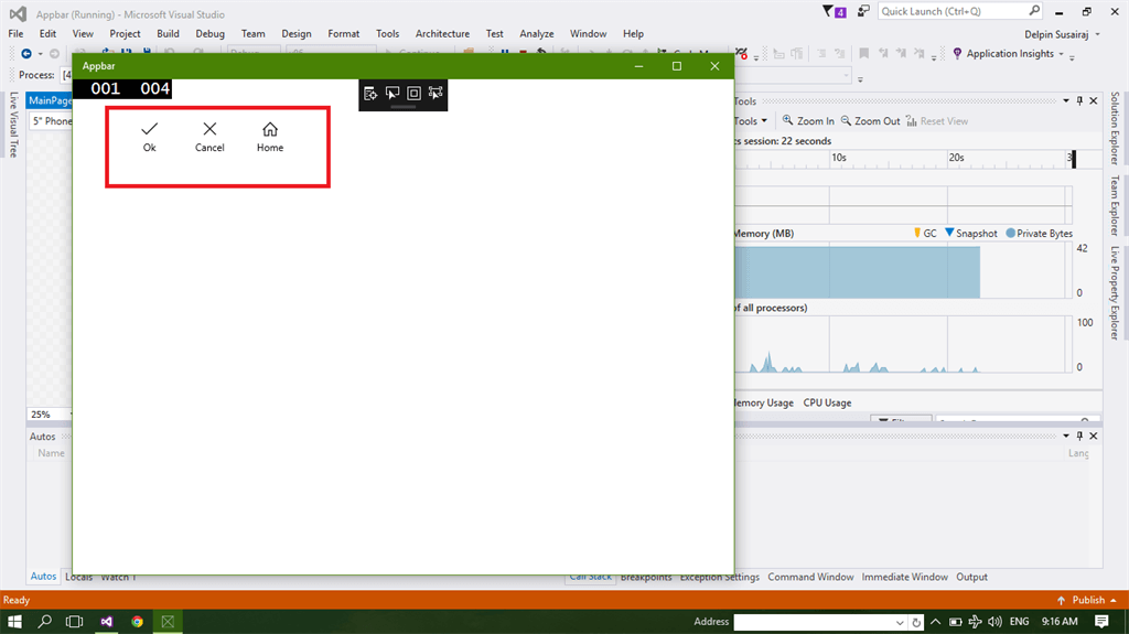Step 4 - Edit the Lable of the appbar control button in properties Window. Chose the appbar control, go to the Properties Window. Edit the lable text.