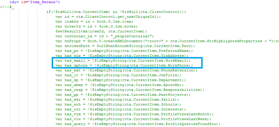 - <!--#_ var encodedwphone = $htmlEncode(ctx.CurrentItem.WorkPhone); var displaywphone = Srch.U.getSingleHHXMLNodeValue(hhProps, "WorkPhone"); if ($isEmptyString(displaywphone)) { displaywphone = encodedwphone } _#-->