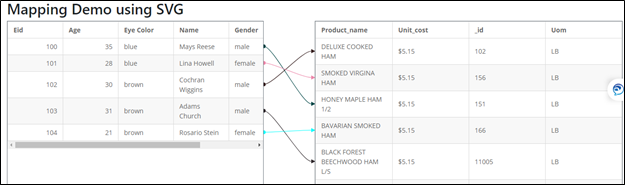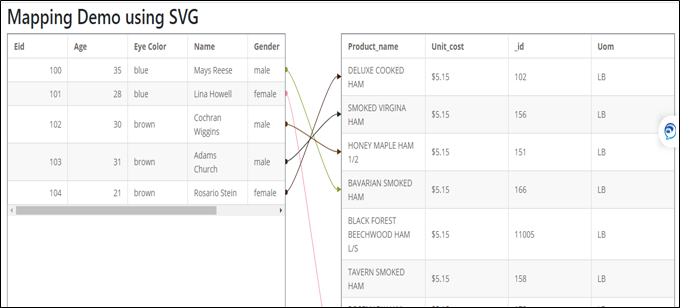 For this demo, we will try to create a mapping between customers & products. We could have any data for that matter, since our main aim from this article is to understand the logic behind creating the mapping between 2 HTML tables using SVG. I’ll be using JSON files for both datasets, which we’ll try to fetch using HTTP requests in order to simulate the HTTP calls in the real world. Below is the snapshot of what we’ll build in this demo.