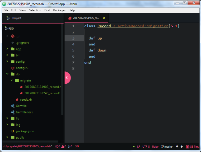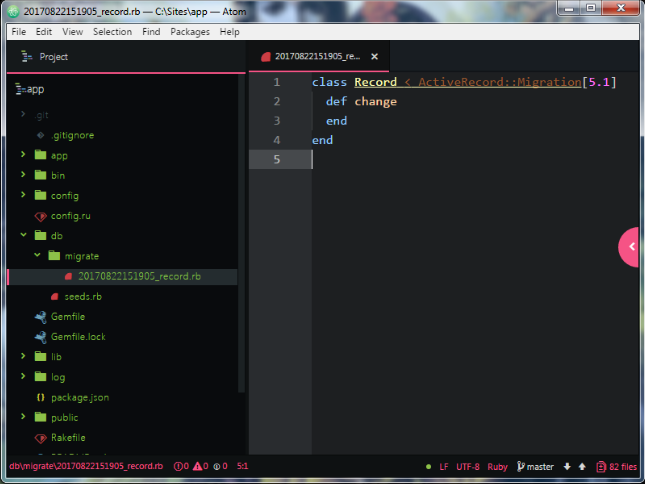 - The migration file is located in db directory, inside migrate, and that file has Ruby class defined in it. You can see our file name record there. It inherits from active record migration. That class is called one method.