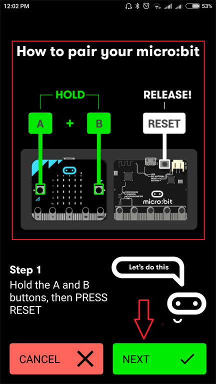 Then, you will see instructions on how to pair your Micro:Bit. As you're seeing below, you just need to hold both - A and B - then press and release the RESET button.