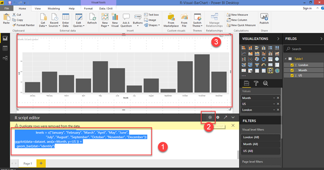 - Select code and click on Run button. ( Refer numeral 1 and 2 from Figure below ) The visual will look like the following image. (Refer numeral 3 from the following Figure).