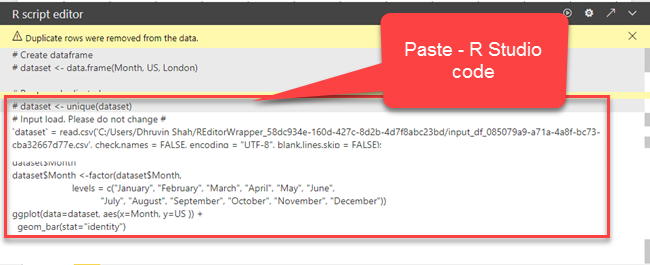 - Now, we will copy the same code from R Studio and paste it to Power BI R script visual.