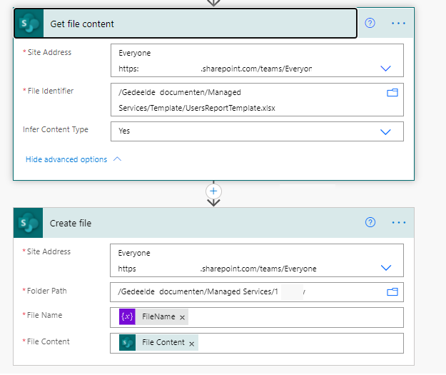 We will use “Get File Content” to get content from the existing excel file template and “Create File” to create a new file in the desire location in SharePoint.