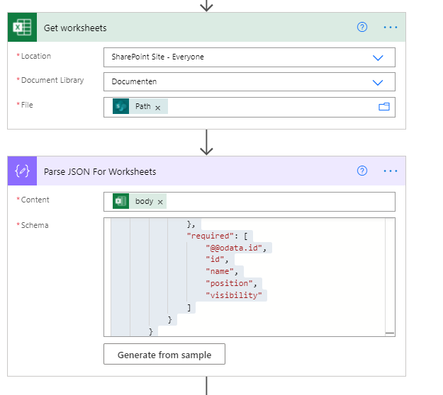 “Parse Json” connector is used to access response from getting Worksheet connector.