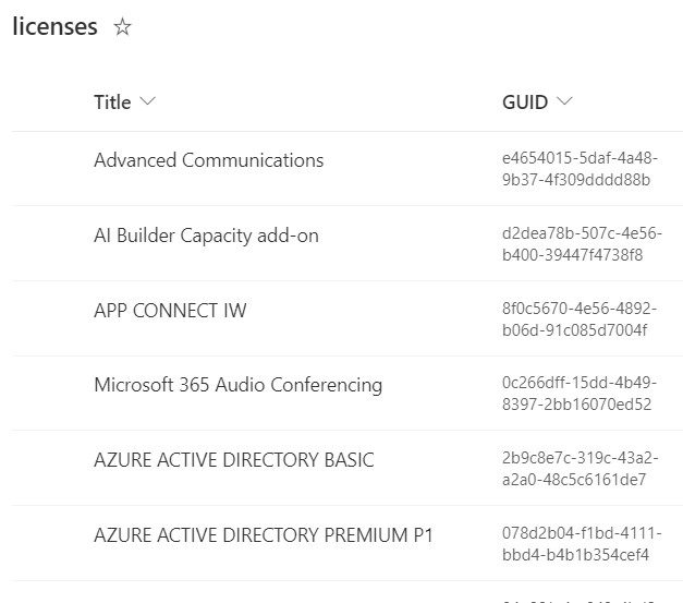 Create a new list called “licenses” in SharePoint Site and add a column called GUID. Add Product Name and GUID from above Microsoft Documents.