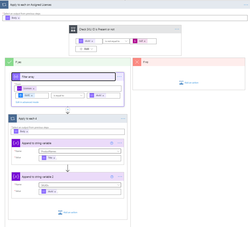 Let's filter the array if we found licenses are assigned to the user. We can get SKU ID from the response and we do filter from licenses array based on SKU IDs.