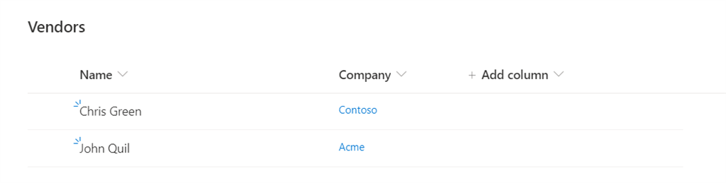 A list to store vendor information, which will have a lookup column (Company) to the above list.
