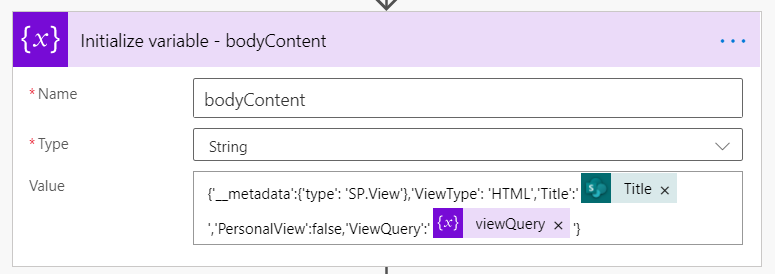 - {'__metadata':{'type': 'SP.View'},'ViewType': 'HTML','Title':'@{triggerOutputs()?['body/Title']}','PersonalView':false,'ViewQuery':'@{variables('viewQuery')}'}