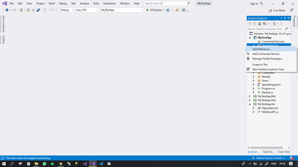 - Similarly Open MyTestApp.IAL andLeft-click on "Dependencies" and go to Add Reference. Select "MyTestApp.DAL" and click ok.