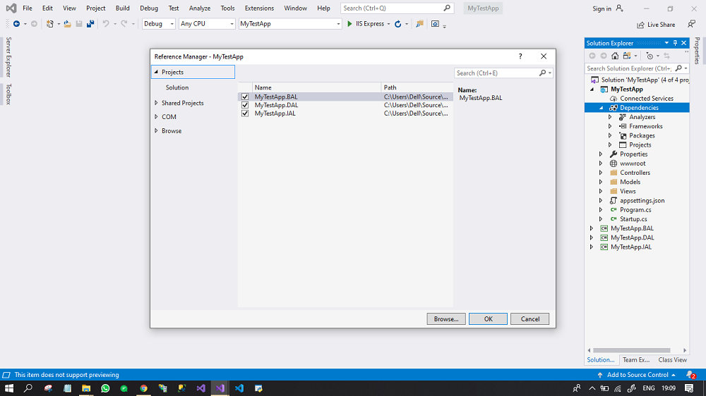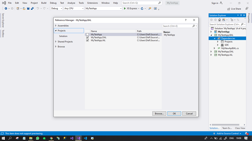 - Similarly Open MyTestApp.BAL andLeft-click on "Dependencies" and go to Add Reference. Select "MyTestApp.DAL, MyTestApp.IAL" and click ok.