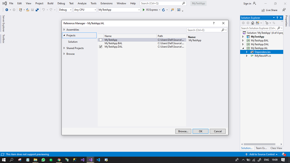 - Select "MyTestApp.BAL, MyTestApp.DAL, MyTestApp.IAL" and click ok.