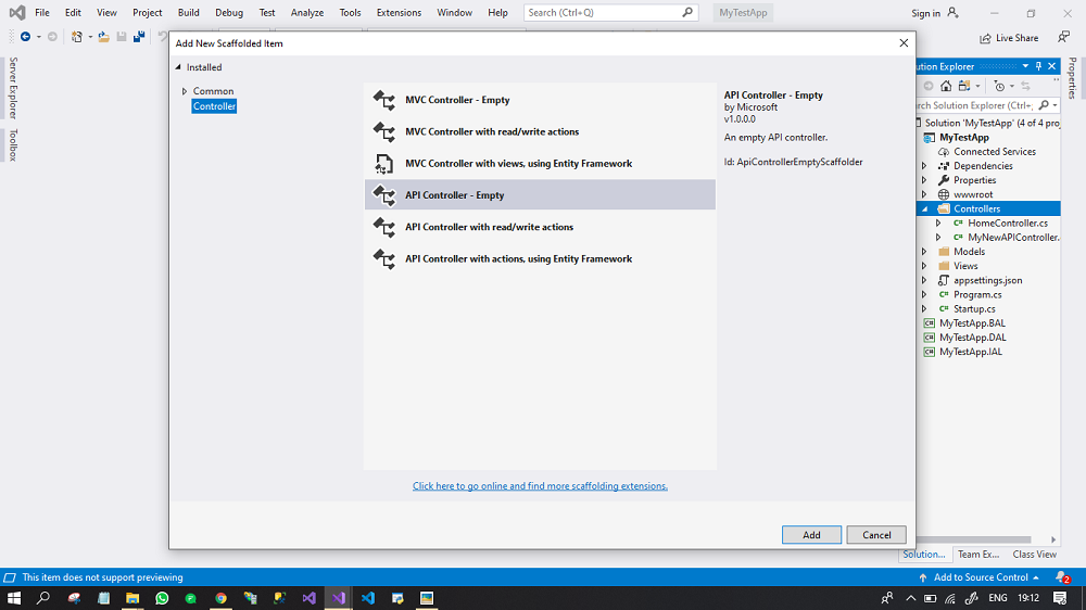Now Left-click on the controller and click on "Add" and click on "Controller" and then select "API Controller - Empty" and then give a name for your controller, in my case, I have given it as "MyNewAPIController".