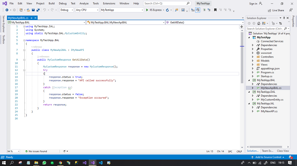And now create a custom class file with the following name "MyCustomEntity.cs" in "MyTestApp.DAL" and then create a class with the following variable where this variable is used in returning the value from API in the form of JSON response.