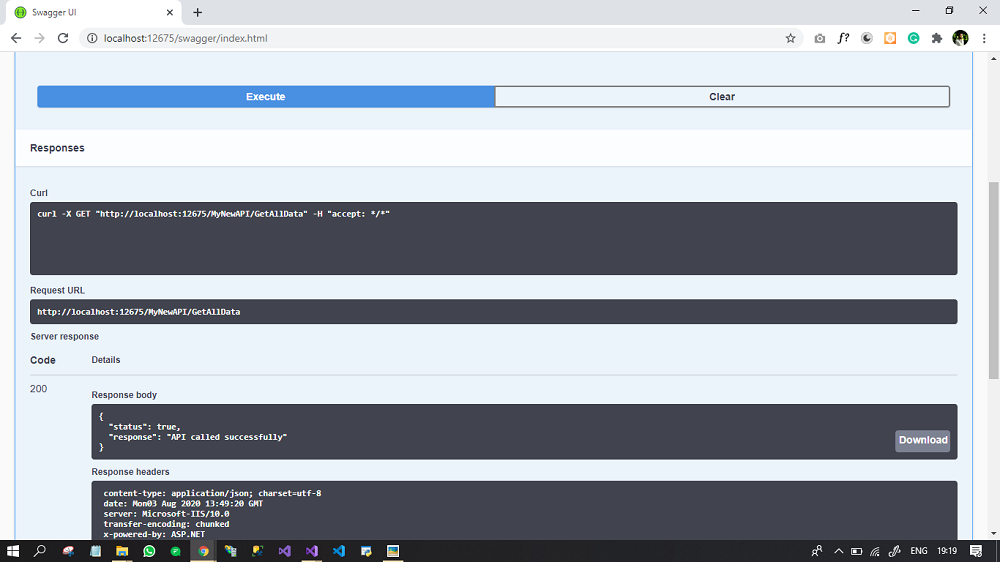 And under MyNewAPI press on GetAllData API and press on Try it out and then press on Execute.