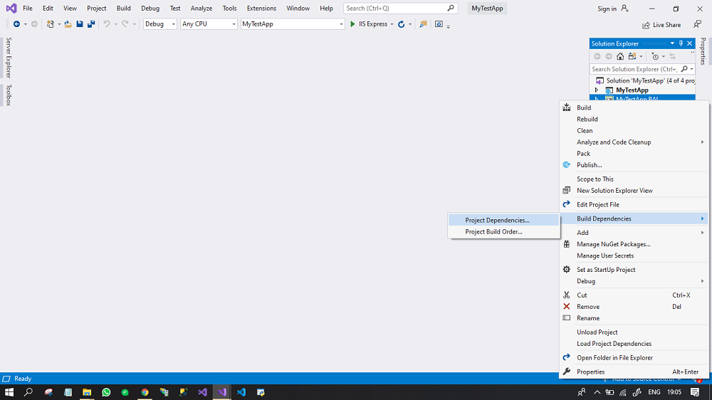 Left-click on "MyTestApp" and go to Build Dependencies and go to Project Dependencies.