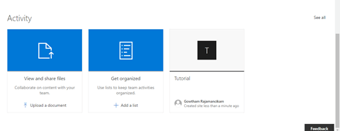 For example, you can use a team site to store and collaborate on files or to create and manage lists of information. On a team site home page, you can view links to important team files, apps, and web pages and see recent site activity in the activity feed.