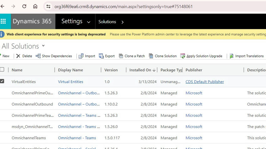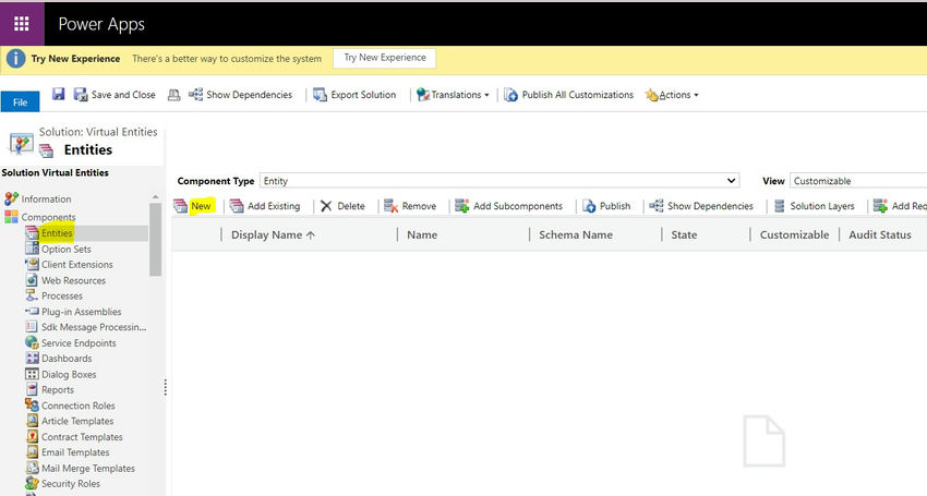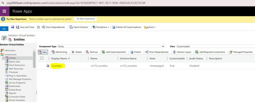 3. Go to Solutions, Select the solution where you want to create a virtual entity(In my case solution name is virtual entities).