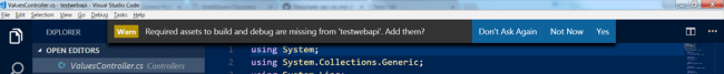 So, select "Yes" to the warning message "Required assets to build and debug are missing from 'TodoApi'. Add them?"