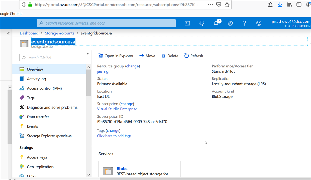 Whenever a BLOB is added or deleted, an event will be fired which will be captured inside our proposed Event Grid. I created a normal BLOB storage account, eventgridsourcesa, and there's nothing special in it.