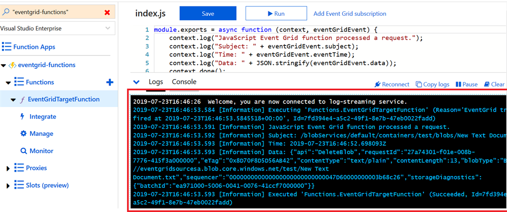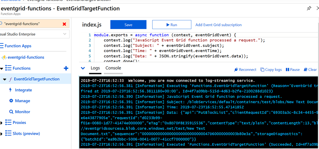 - 2019-07-23T16:52:56.381 [Information] Executing 'Functions.EventGridTargetFunction' (Reason='EventGrid trigger fired at 2019-07-23T16:52:56.3811180+00:00', Id=4f7a09bb-515d-4d63-b2fe-2100288d1023)