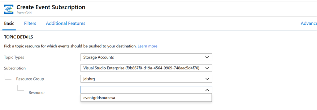 Under the "TOPIC DETAILS" section, choose your event source storage account created above.