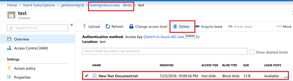 - 2019-07-23T16:46:53.593 [Information] Data: {"api":"DeleteBlob","requestId":"27a74301-f01e-008b-7776-415f3a000000","eTag":"0x8D70F8D5D56AB42","contentType":"text/plain","contentLength":13,"blobType":"BlockBlob","url":"https://eventgridsourcesa.blob.core.windows.net/test/New Text Document.txt","sequencer":"000000000000000000000000000047D60000000003b68c26","storageDiagnostics":{"batchId":"ea971000-5006-0041-0076-41ccf7000000"}}