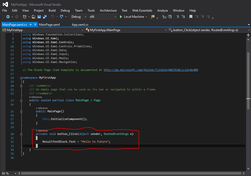 - Now we have done with our front end, it’s time to add functionality to our button control. Click on the Wave like icon on the top in the properties window of button or double-click the Click box, it will take you automatically to MainPage.xaml.cs file. Here's the screenshot: