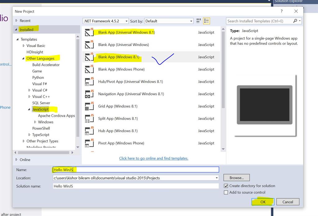 Go to File, New, then Project. Under Other Languages, click JavaScript, then select Blank App (Universal Windows) or Blank App