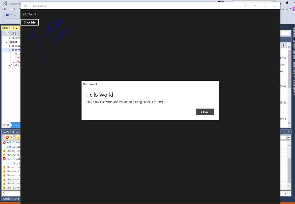 - var msg = new Windows.UI.Popups.MessageDialog("This is my first winJS application built using HTML, CSS and JS.", "Hello World!");
