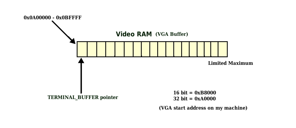 Here we are using 16 bit, on my machine the VGA address is starts at 0xB8000 and 32 bit starts at 0xA0000. An unsigned 16 bit type terminal buffer pointer that points to VGA address.