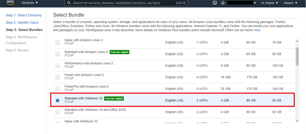 (If you are new to AWS Workspaces, select free tier images)