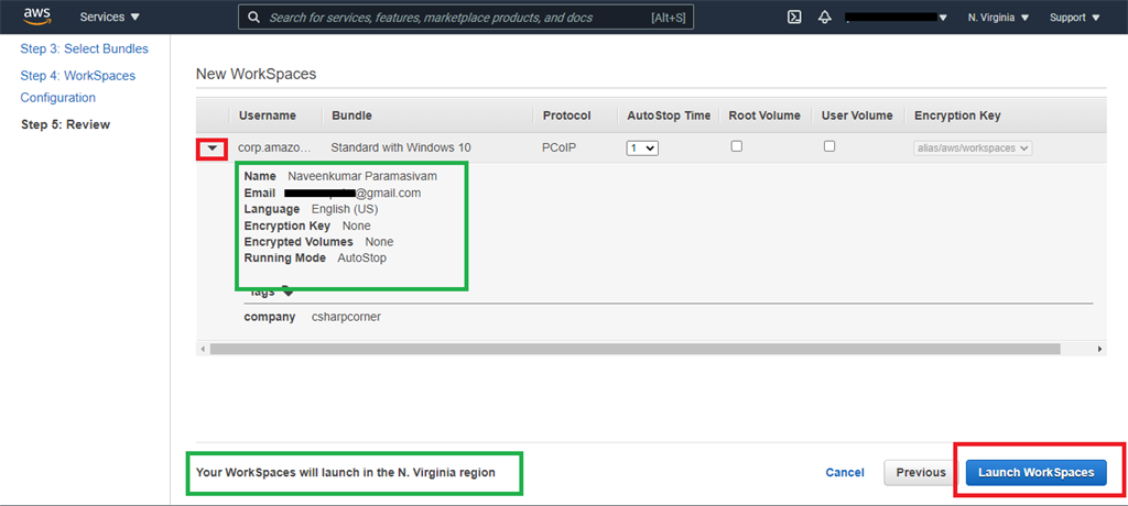 In the fifth step review the VM creation. Click the dropdown icon to view our VM details and finally click the “Launch Workspaces” button.