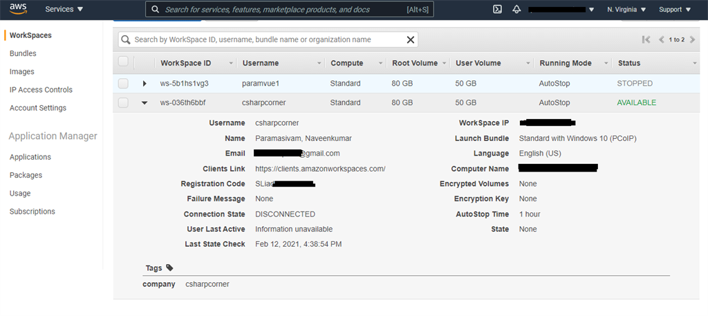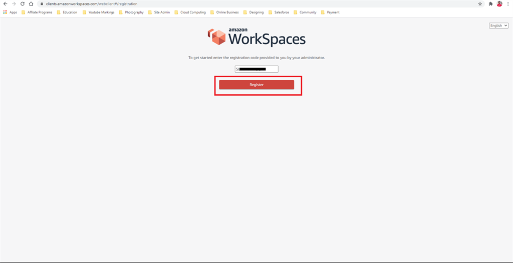 Go back to our AWS Workspace console, select our created VM name drop down icon. Get the registration code.